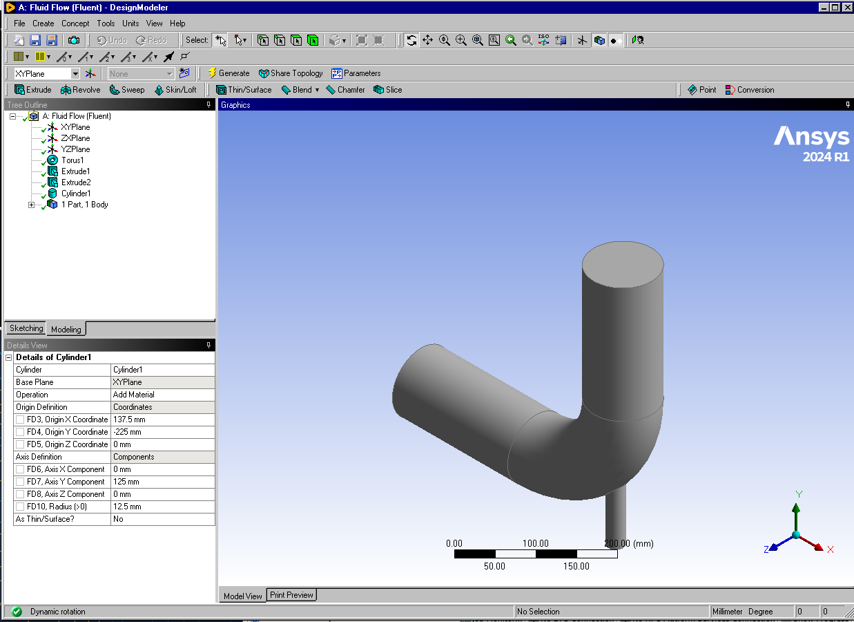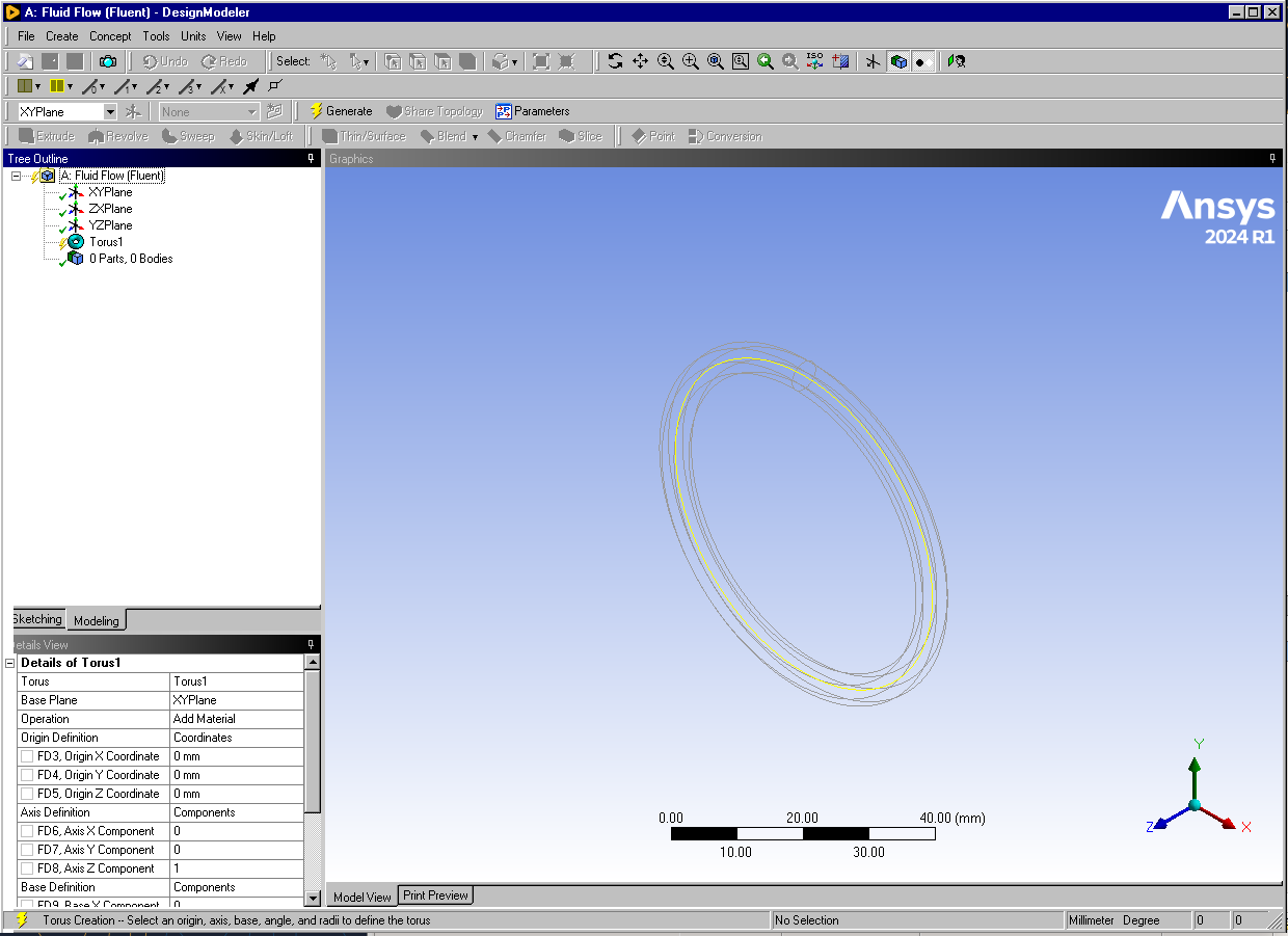 トーラス(主管の曲線部分)が作成されます。Tree OutlineにはTorus1という項目が追加されます。