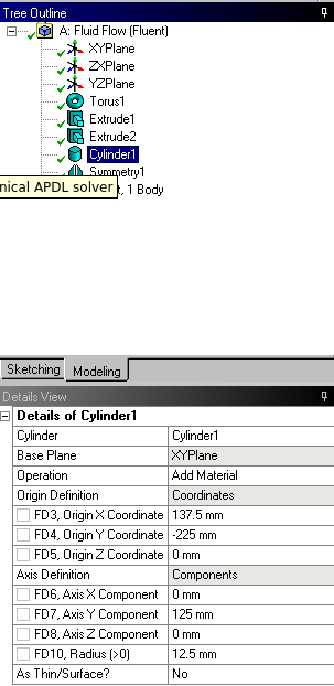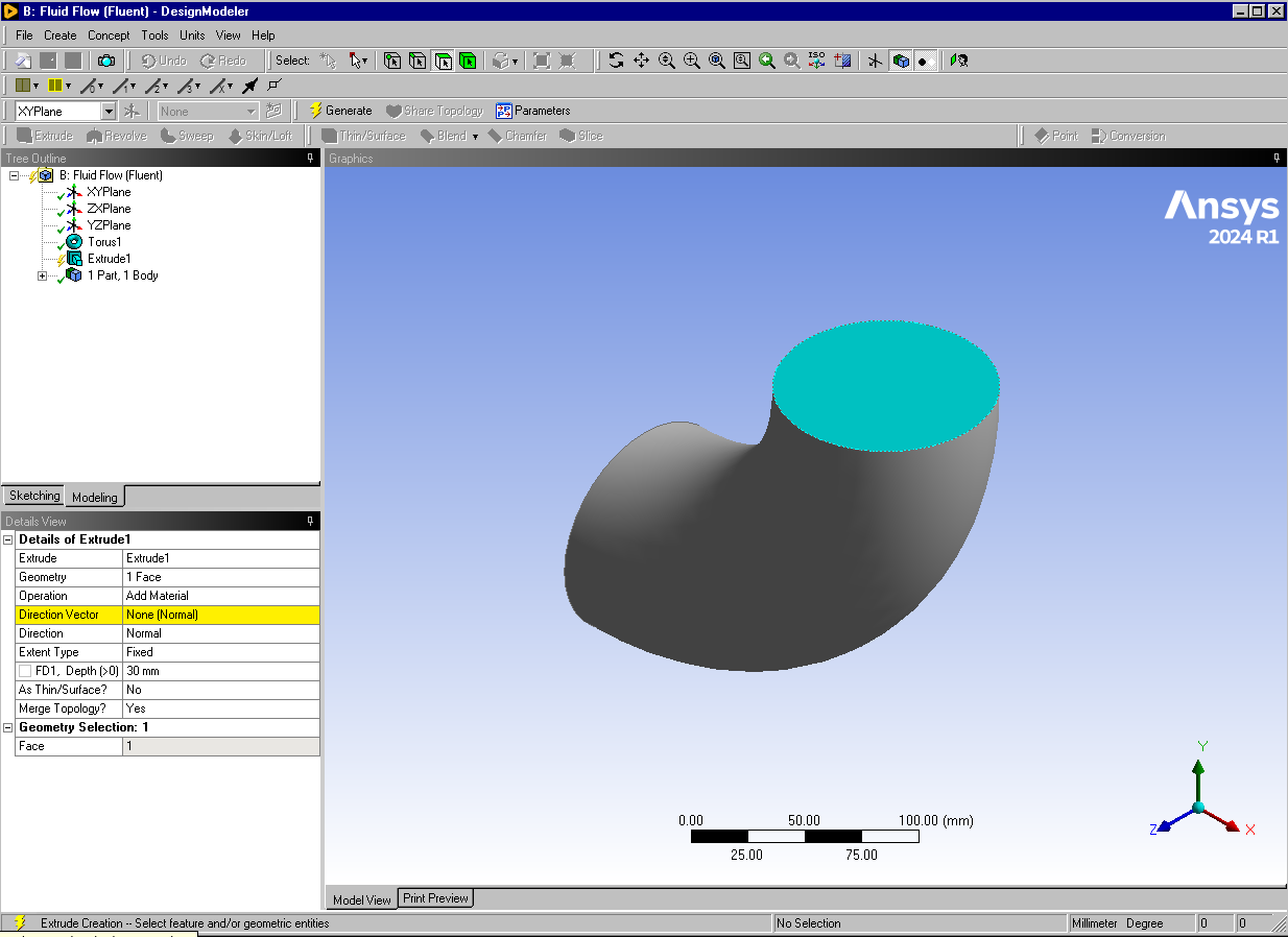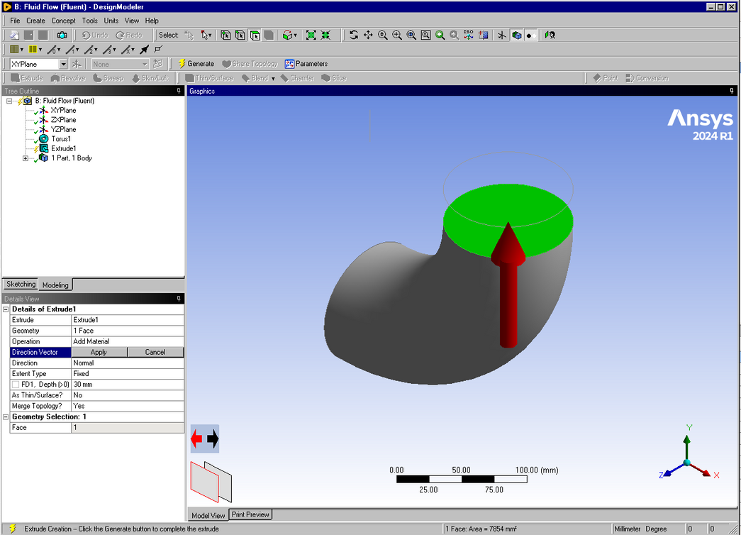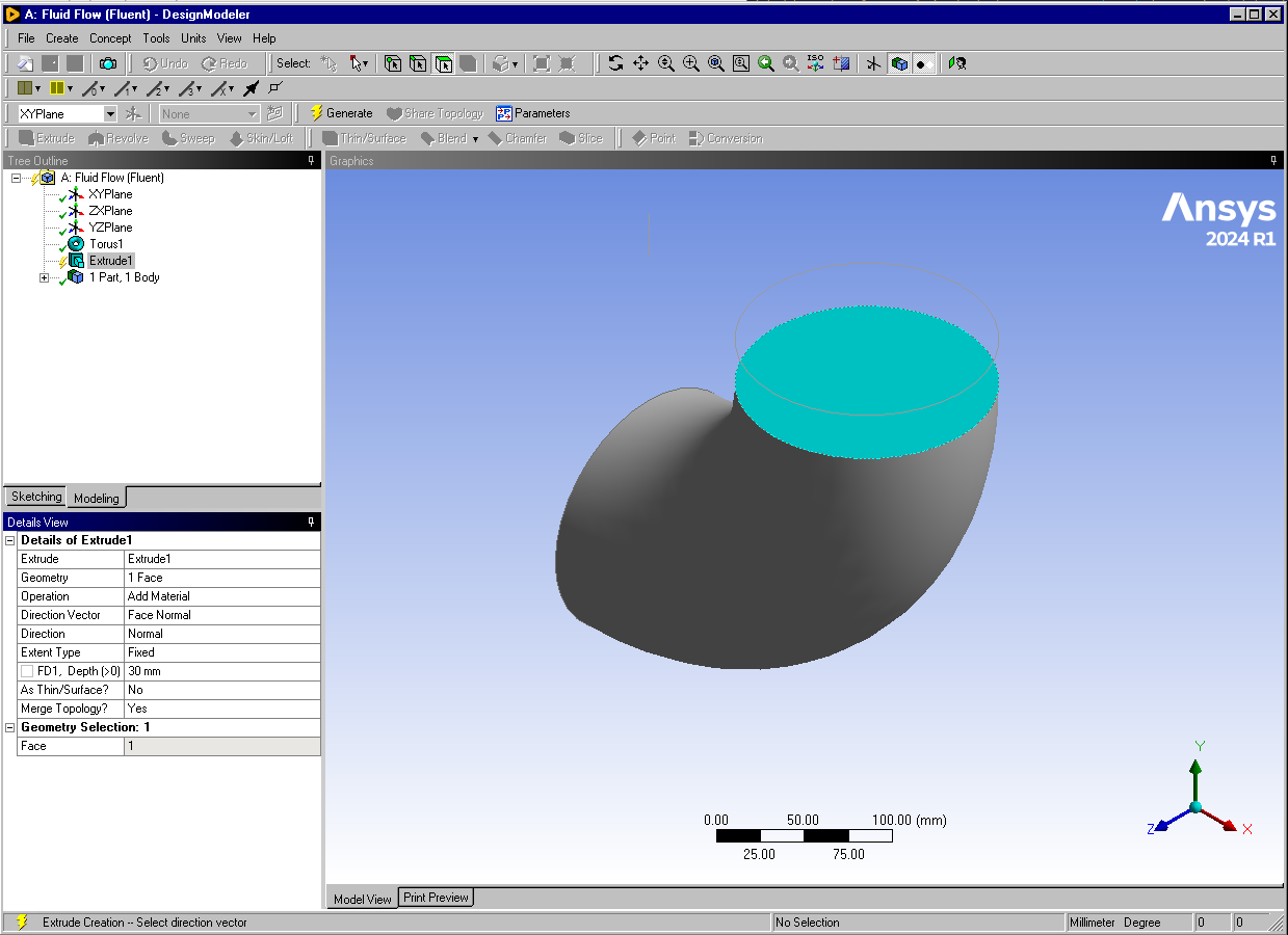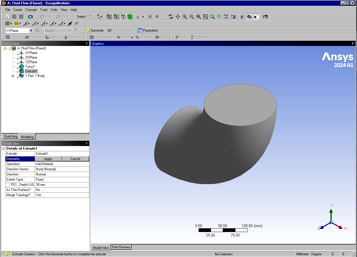 Details View 内 Details of Extrude1のGeometryの[Apply]/[Cancel]選択ボタンのうち[Apply]をクリックします。