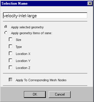 Selection Nameダイアログが開きます。ここで、テキストボックスを「Selection」から「velocity-inlet-large」に変更し、OKをクリックしてダイアログを閉じます。