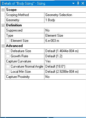 Body Sizingを選択した状態でDetails of “Body Sizing” - SizingのDefinition > Element Sizeに 6e-3 と入力します。