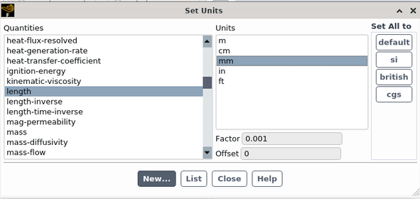 Quantitiesに「length」、Unitsに「mm」を選択し、[Close] をクリックします。