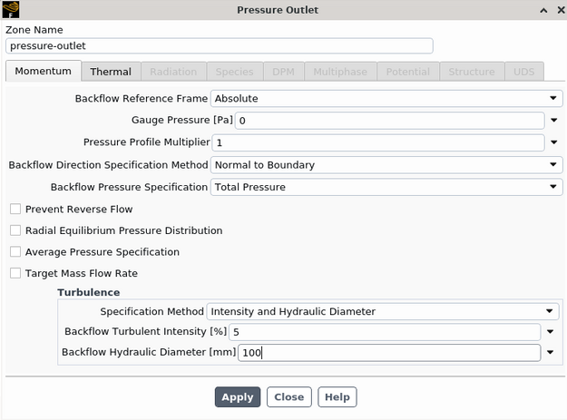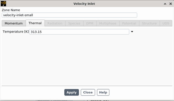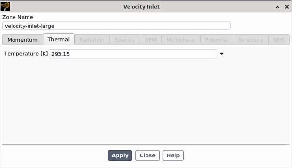 [Thermal]タブのTemperature (k)を 293.15に変更し、[Apply] [Close]をクリックしてVerocity Inletダイアログを閉じます。