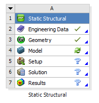 Toolboxのリストから使用したいソフトウェアをダブルクリックすると、Project Schematicに解析システム(テーブル)が起動します。 下記はStatic Stracturalの解析システムを起動した画面です。