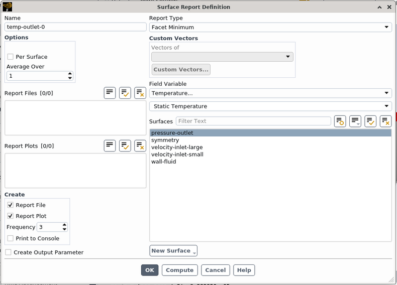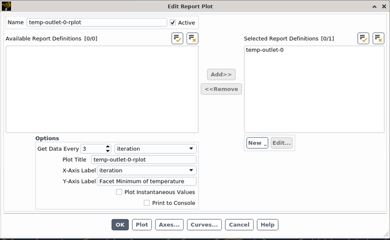 Solution > Monitors > Report Files > temp-outlet-0-rplotをダブルクリックし、Edit Report Plotダイアログを開き、設定を確認します。