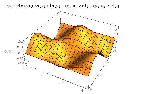 Plot3D[Cos[x]Sin[y], {x, 0, 2Pi}, {y, 0, 2Pi}]