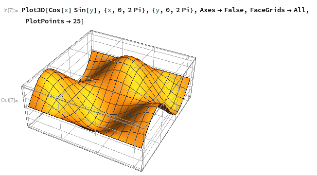 Plot3D[Cos[x]Sin[y], {x, 0, 2Pi}, {y, 0, 2Pi},