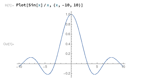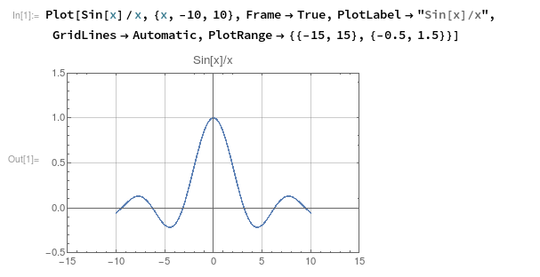 Plot[Sin[x]/x, {x, -10, 10}, Frame -> True, PlotLabel -> "Sin[x]/x",