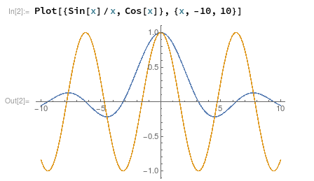 Plot[{Sin[x]/x, Cos[x]}, {x, -10, 10},