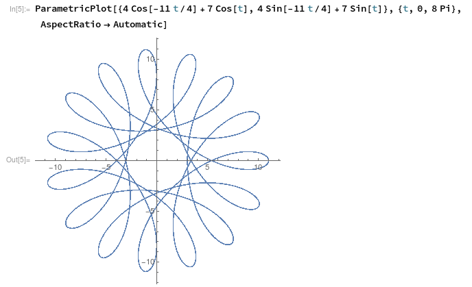ParametricPlot[{4Cos[-11t/4] + 7Cos[t], 4Sin[-11t/4]+7Sin[t]}, {t, 0, 8Pi},