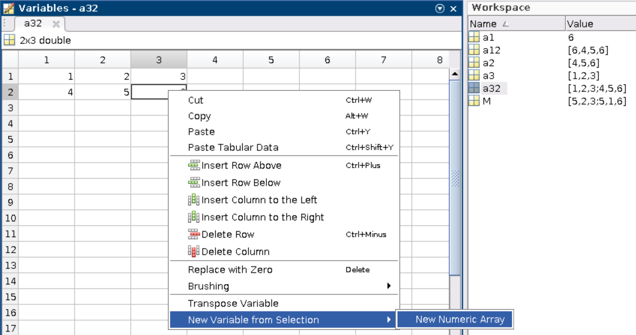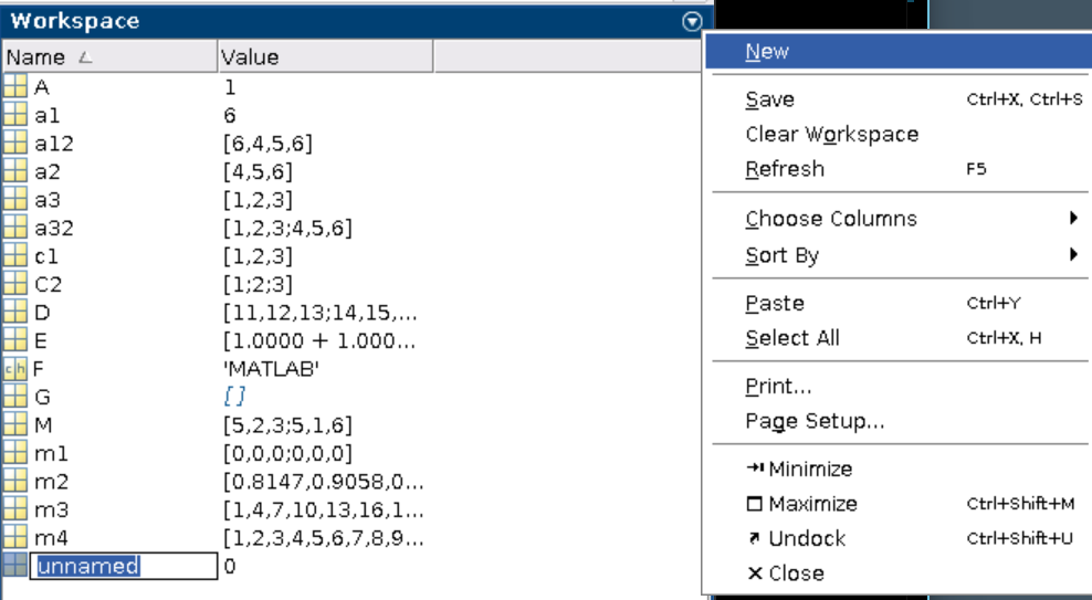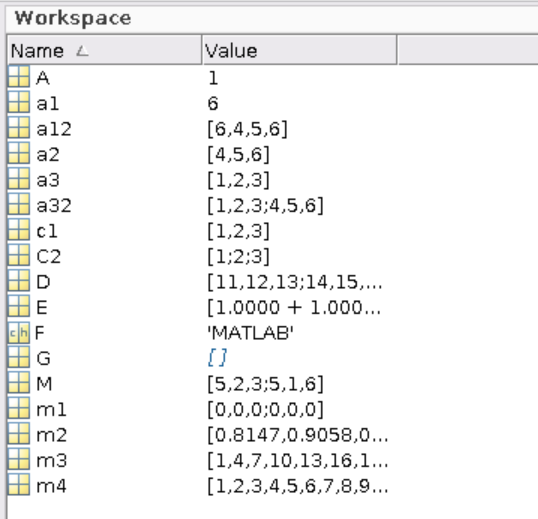 MATLAB上で定義された変数の一覧を表示するウィンドウです。 Workspaceとは、変数に対してMATLABが自動的に割り当てるメモリ領域のことをいいます。 また、変数を右クリックで選択すると変数のプロットや各種の編集を行うことができます。