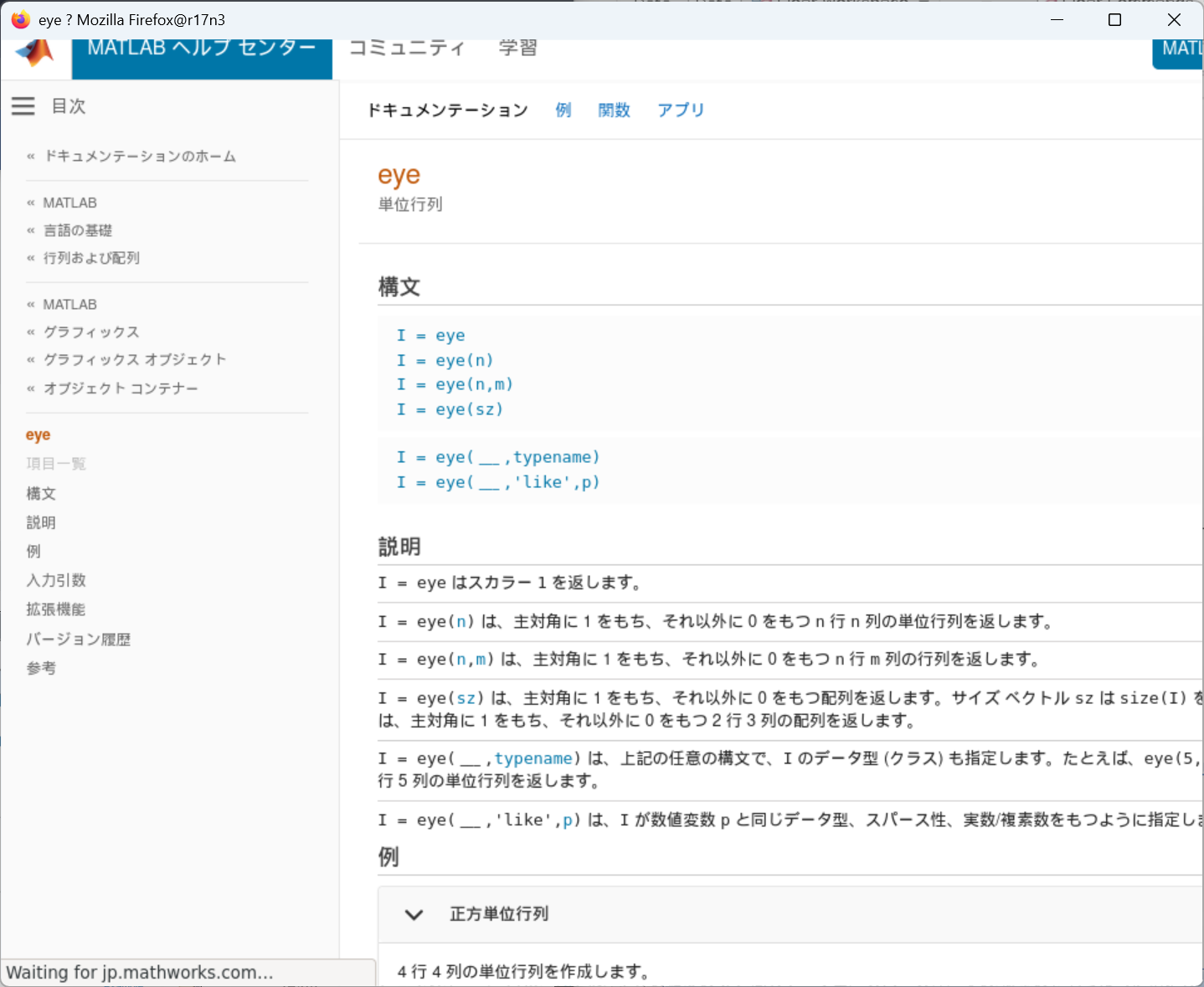 関数やコマンド名が既に分かっている場合、その機能・使用法について調べる方法は大きく分けて2つあります。 ここでは単位行列を作成するeye関数を例として説明します。