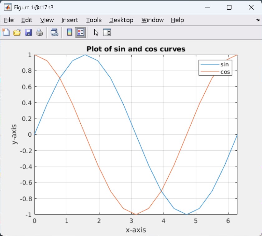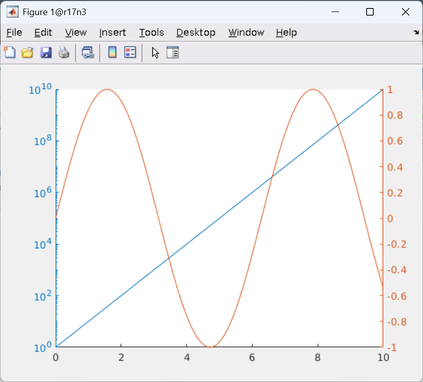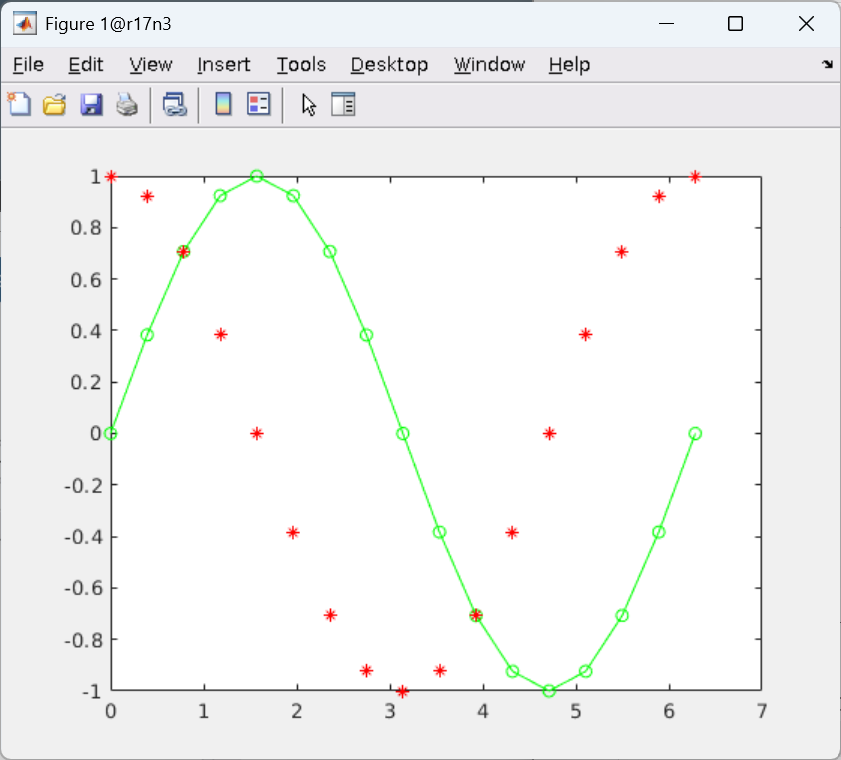 (x1,y1),(x2,y2)はそれぞれ表示するデータの組み合わせを表します。 また、’Color LineStyle Marker’は描画するラインのオプションのプロパティを表し、 それぞれ線の色、線種、マーカーを指定します。 線 のプロパティの詳細については、「doc linespec」コマンドで確認して下さい。