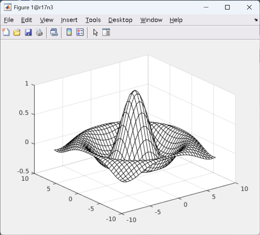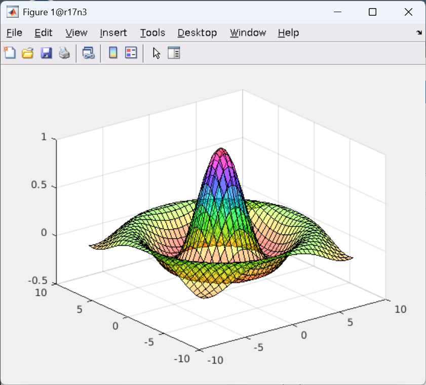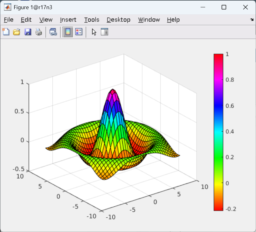 (例) 2次元sinc関数、sin(r)/r をx およびy 方向で実行しグラフ化します。 R は、行列の中心である原点からの距離です。 eps (小さな浮動小数点数を出力するMATLABコマンド)を加えると、 原点での0/0が中間で生じることを避けることができます。