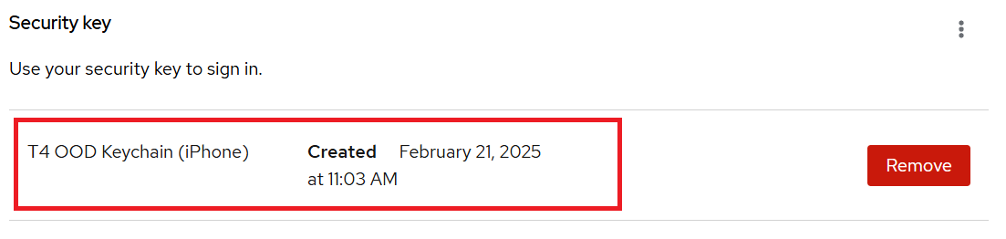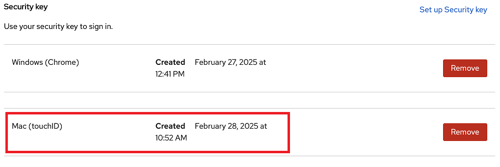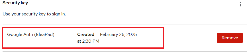 From the list of Security keys, press “Remove” on the far right of the security device you wish to remove.