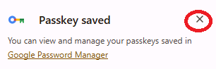 Press "x" and close "Saved passkey" dialog,