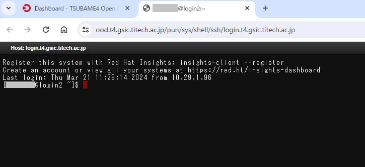 Clusters > TSUBAME cluster Shell Access を押すと、TSUBAME にターミナルでログインすることができます。ターミナルは複数開くことができます。