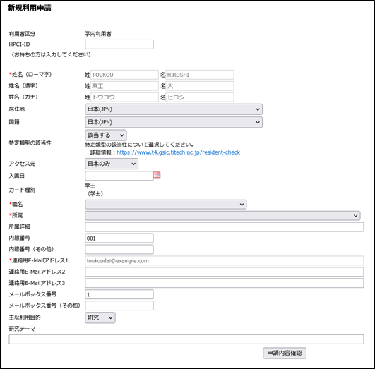 アカウント登録内容のうち、東京科学大学理工学系ポータルに登録済の情報が自動で入力されます。 空欄の部分を入力し「申請内容確認」ボタンを押します。 *で示された項目は入力/選択必須項目です。