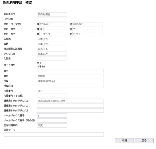 内容を確認後、「申請」ボタンを押してください。 申請内容について審査が行われ、審査に通過すると、アカウントが登録されます。 もし、情報基盤センター担当者の承認が必要と判断された場合は、情報基盤センター担当者が承認の可否を判断し、承認された場合に登録されます。