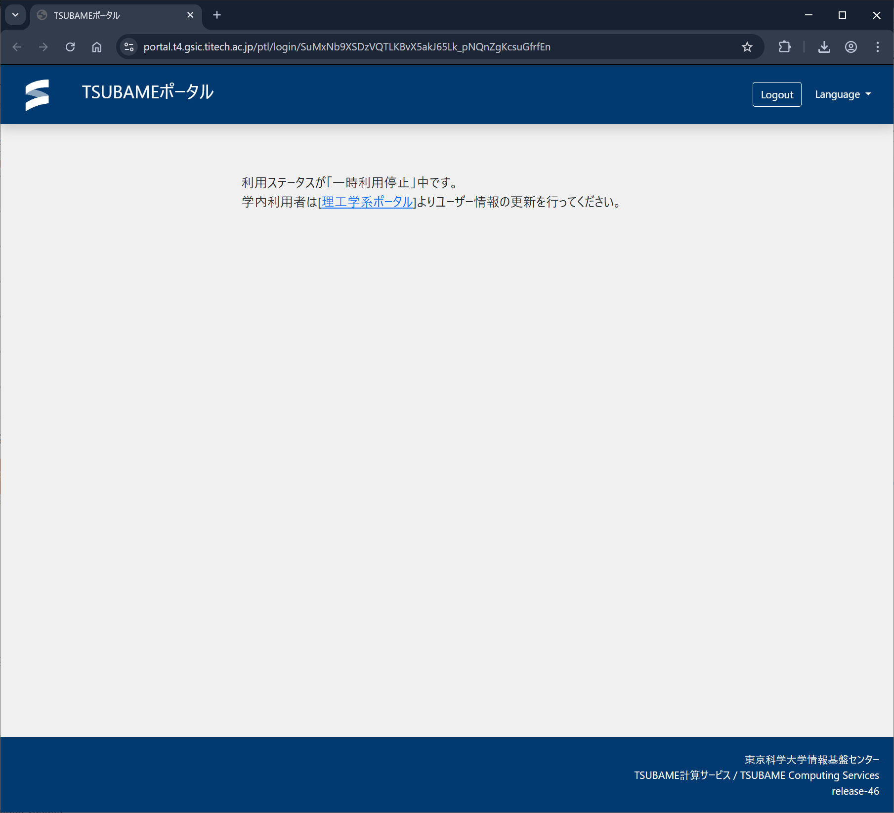 一時利用停止状態のアカウントでTSUBAME4 ポータルにログインした場合、以下の画面が表示されます。