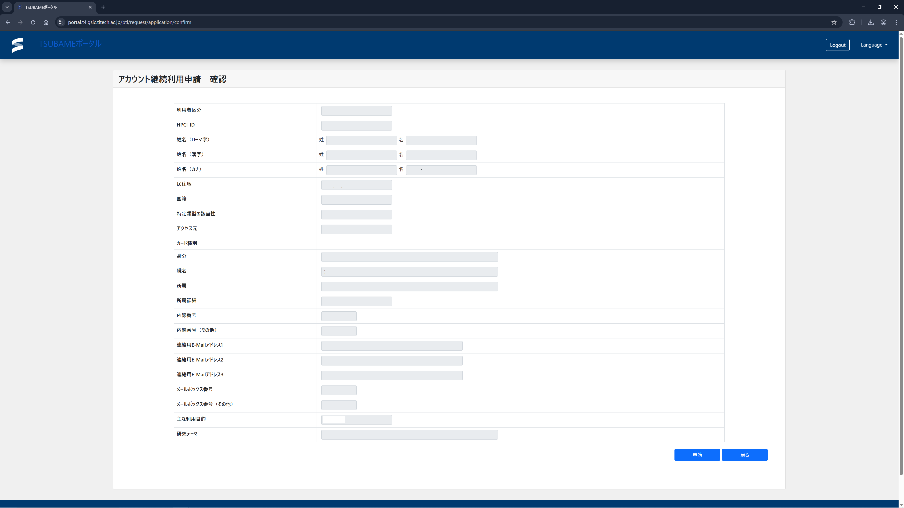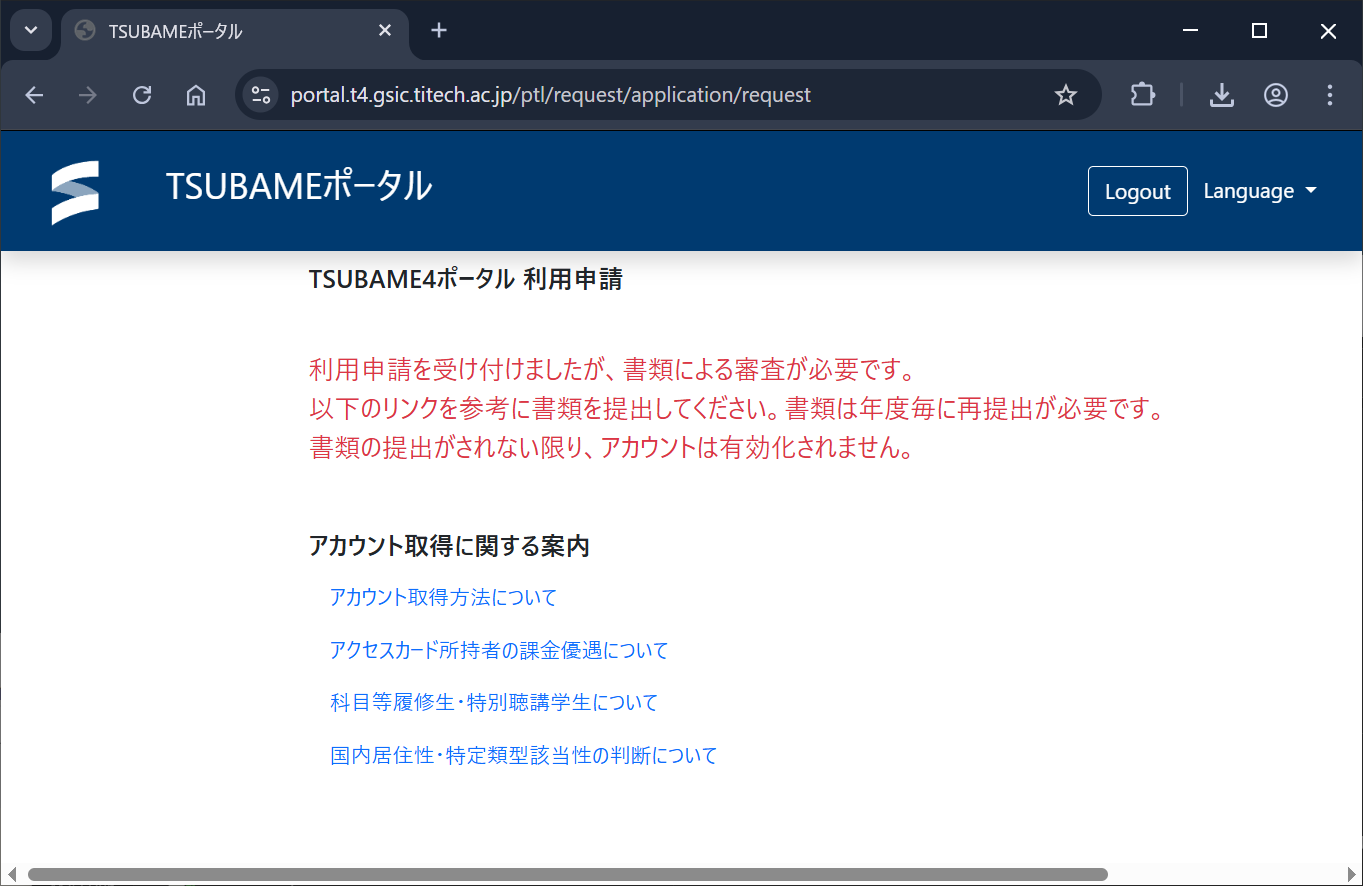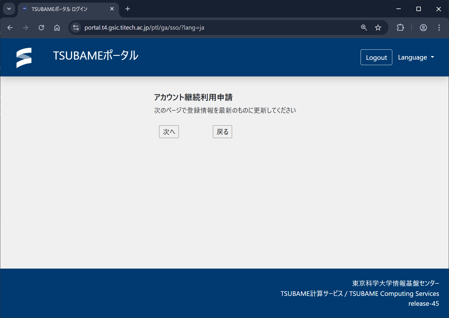 東京科学大学理工学系ポータル経由でTSUBAME4 ポータルにログインした場合、以下の画面が表示されます。