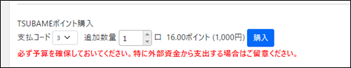 「TSUBAMEポイント購入」画面では、支払コードと追加数量を指定して「購入」ボタンを押すと、確認おダイアログが表示されます。