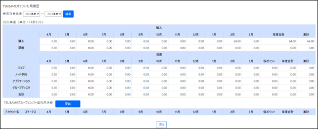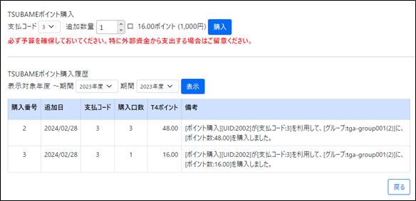 「TSUBAMEグループ詳細」画面にある「ポイント購入」ボタンを押すと、「TSUBAMEポイント購入」画面に遷移します。 表示対象年度で指定した期間(年度単位)の購入履歴を表示すること可能です。