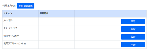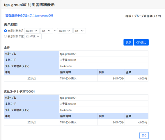 「TSUBAMEグループ詳細」画面において、利用オプションの「利用明細確認」ボタンを押して、「利用明細確認」画面に遷移します。