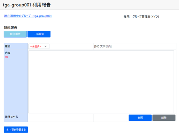 「利用報告」のメニュー中の「個別報告」を選択してください。 入力画面が表示されます。