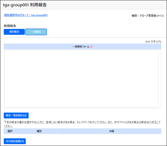 「利用報告」のメニュー中の「一括報告」を選択してください。 入力フォームが表示されます。