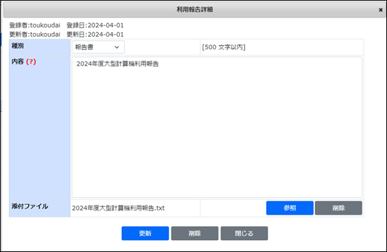 | 添付ファイル | 提出する利用報告に添付するファイルを指定します。 |