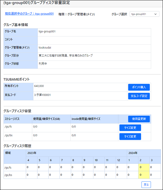 グループディスクの利用に必要なTSUBAMEポイント数、購入可能容量の上限値などについては「利用料の概略」内の「TSUBAMEポイントについて」を参照してください。