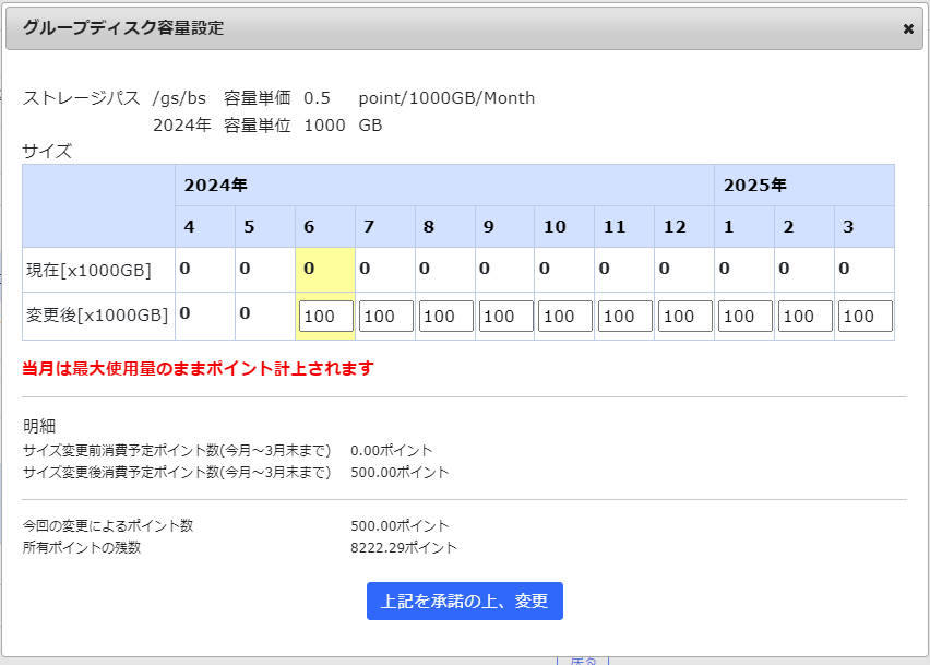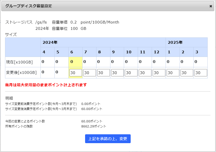 当月以降、当年度内の各月についての使用容量を入力し、「上記を承諾の上、変更」ボタンを押すと、当月以降の容量が変更されます。 当月の容量を変更した場合は、操作を行った直後に使用可能なグループディスクの容量が変更されます。 翌月以降についての容量を変更した場合は、当該の月の1日を迎えた時点で容量が自動的に変更されます。