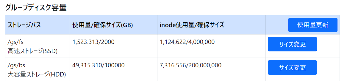グループディスクの容量設定および保存可能なファイル数(inode数)は、利用するストレージによって異なります。
