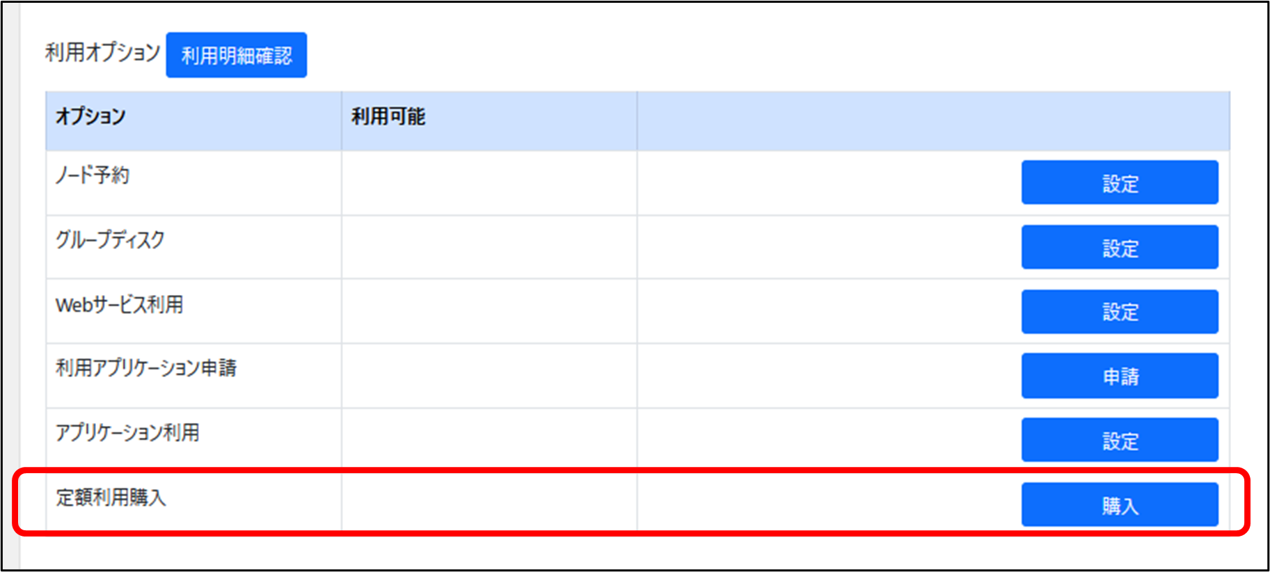 計算機ノードの定額利用を申請する場合は、グループ詳細の画面から、「定額利用購入」の「購入」ボタンをクリックします。