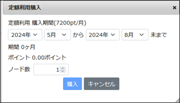 ボタンをクリックすると、利用期間を指定するダイアログが表示されます。 利用を希望するのノード数と期間を入力して「購入」ボタンを押すと、定額利用購入の申請を行うことができます。