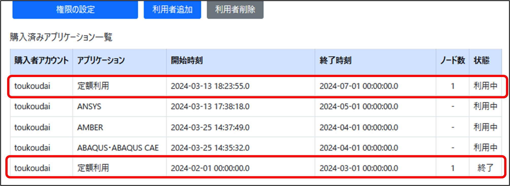購入したノード定額利用サービスは、グループ詳細の下部の「購入済みアプリケーション一覧」に表示されます。