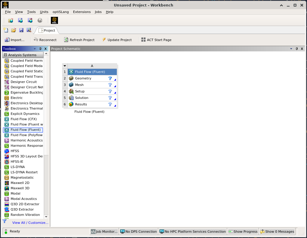 ANSYS Workbenchを起動し、Toolboxビューワー(左ペイン)のField Flow (Fluent) をダブルクリックします。 すると、Project SchematicビューワーにField Flow (Fluent) というラベルの解析システム(テーブル)が表示されます。