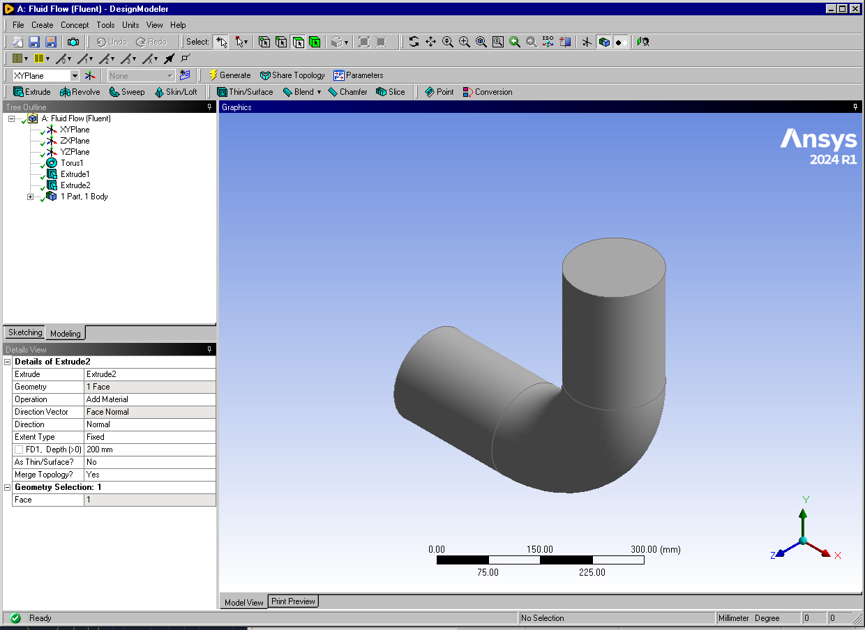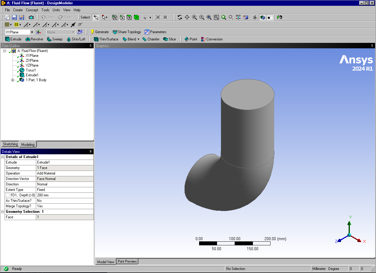 Details View 内 Details of Extrude1のGeometryの[Apply]/[Cancel]選択ボタンのうち[Apply]をクリックします。