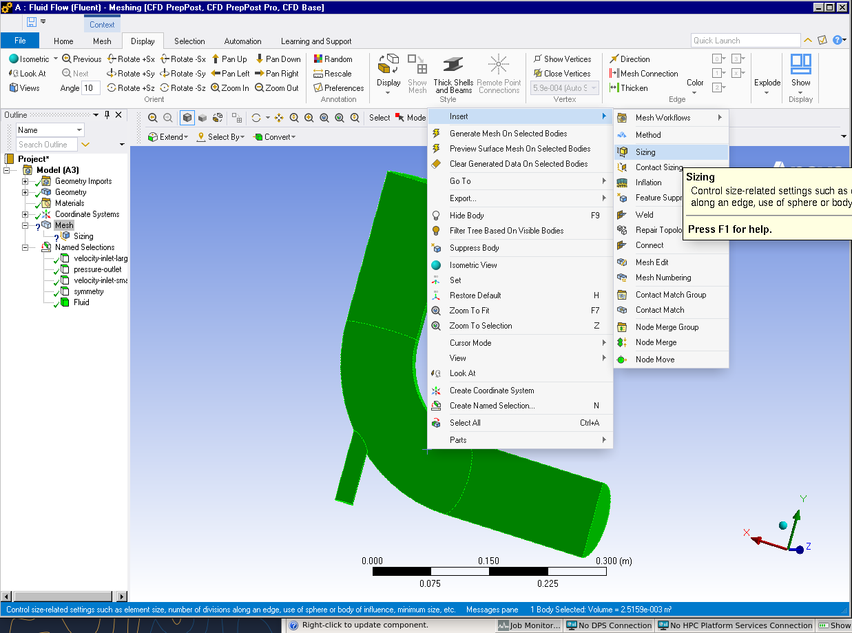 次に、OutlineでMeshが選択されている状態のまま、モデルを選択します。さらに右クリックし、[Insert]-[Sizing]を選択します。