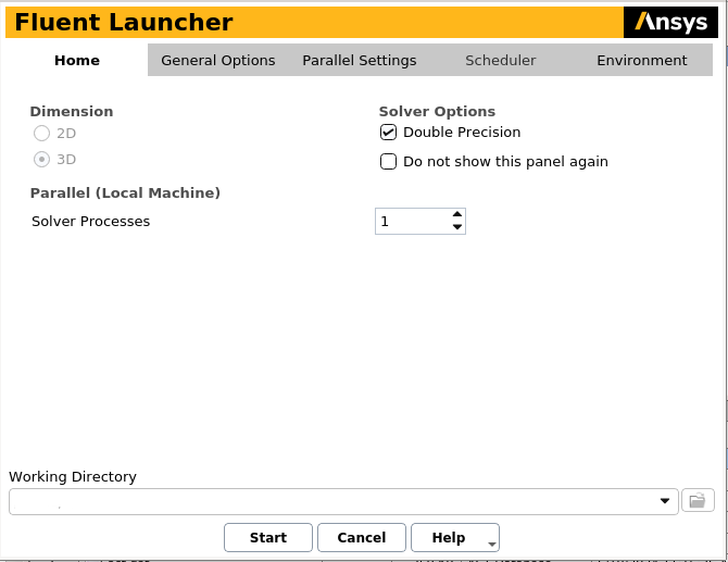 elbow流体解析システムのSetupセルをダブルクリックし、ANSYS Fluentを起動します。 Fluent Launcherダイアログが起動します。OptionsのDouble Precisionにチェックを入れ、[Start]をクリックします。