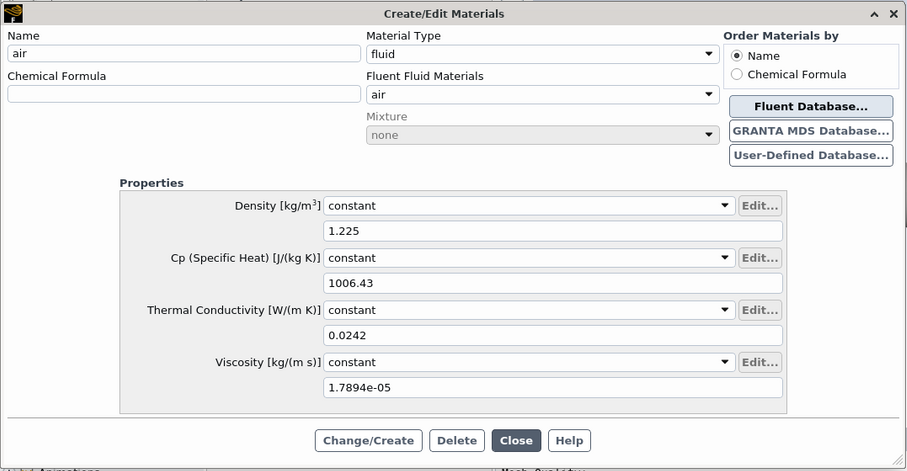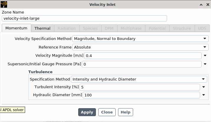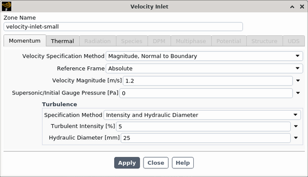[Thermal]タブのTemperature (k)を 293.15に変更し、[Apply] [Close]をクリックしてVerocity Inletダイアログを閉じます。