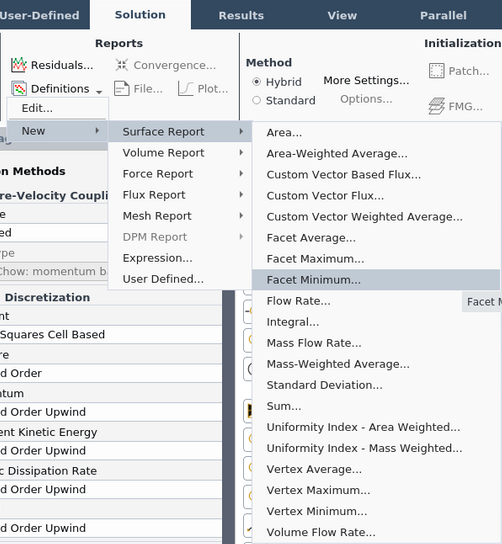 [Solution]-[Reports]-[Definitions]-[New]-[Surface Report]-[Facet Maaximum]を選択します。