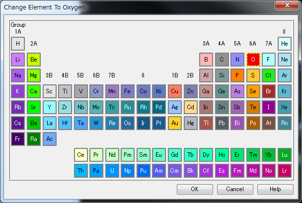 Periodic Table をクリックします。 するとChange Elementダイアログが表示されるので、「O」を選択しOKをクリックします。