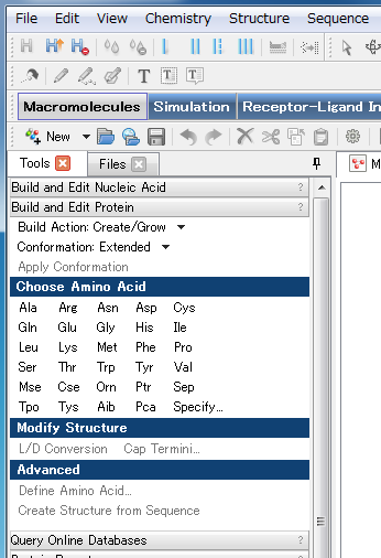 「Macromolecules」Tool Setを選択し、「Tools Explorer」の「Build and Edit Protein」をクリックして展開します。