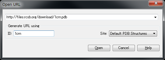 「ID」に取得したいタンパク質または核酸のIDを、「Site」に取得先を指定してOpenをクリックすると、その構造がMolecule Windowsに表示されます。