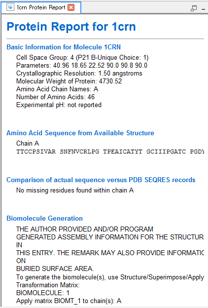MacromoleculesのProtein Reportをクリックすると、その構造に関する情報が表示されます。