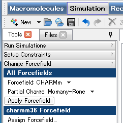 「Simulation」Tool Setを選択し、「Tools」Explorerの「Change Forcefield」をクリックして展開します。