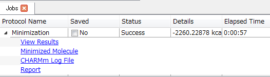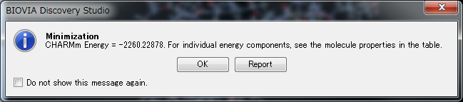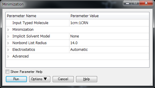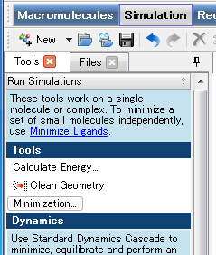 次に、Tools ExplorerのRun Simulationsを展開し、Tools > Minimization をクリックし、Minimizationダイアログを開きます。