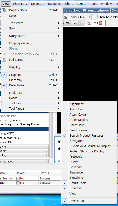 Toolbarsの設定・確認を行います。 「View」→「Toolbars」を選択すると、さらにメニューが表示されます。 表示されたメニューの中でチェックが入っているものが現在表示されているものです。 表示・非表示はそれぞれの項目をクリックすることで行えます。