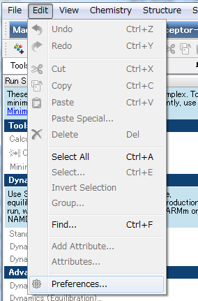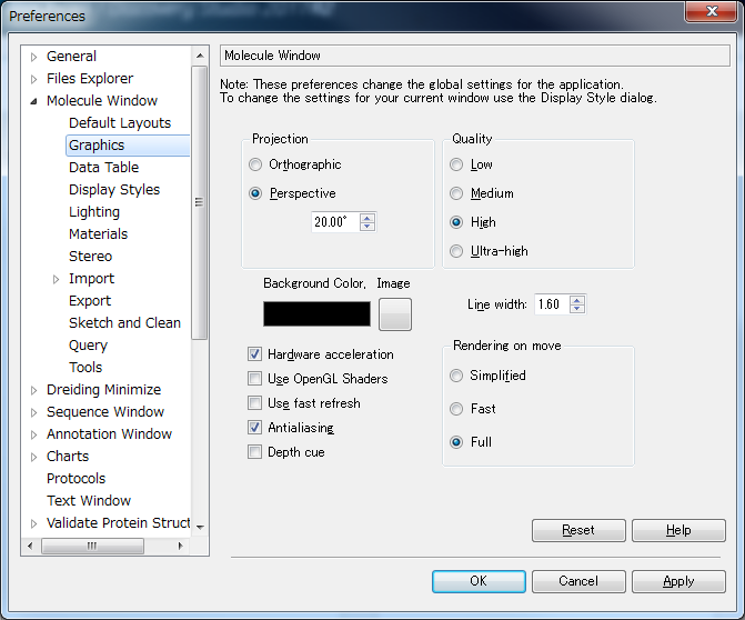 Preferencesウィンドウが立ち上がります。 「Molecule Window」→「Graphics」を選択します。 ここでは、分子の表示形式や背景色の設定を行います。